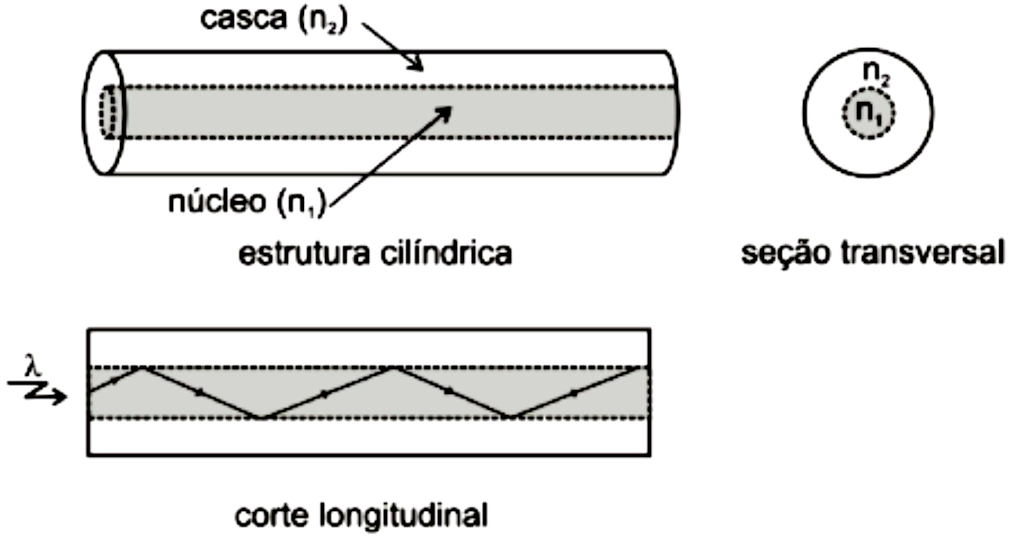 Em 1952, Narinder Singh Kapany desenvolveu experimentos baseando-se nesse fenômeno, levando à criação da fibra ótica. A fibra ótica é um fio composto de material dielétrico, onde é possível fazer a luz se propagar ao longo de sua extensão devido às sucessivas reflexões internas totais. Falamos em reflexão total, pois há casos onde apenas uma porção da luz é refletida enquanto o restante é transmitido (refratada). Essa região interna, onde a luz se propaga, é denominada núcleo da fibra, enquanto a parte externa é chamada de casca (Figura 2).
