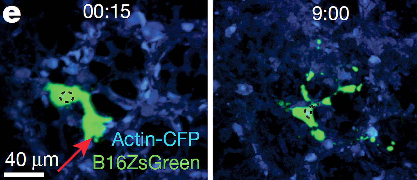 Em março desse ano (2016), o grupo liderado por Max Krummel da Universidade de São Francisco nos EUA, usando o modelo de ratinho (camundongo) de cancro metastático, estudou o comportamento das células malignas de melanoma (tumor da pele) quando estas se alojam no pulmão. Nesse estudo, os investigadores mostraram que as primeiras células tumorais, ao chegarem no pulmão, através da circulação sanguínea, acabam por se fragmentar dentro dos capilares (pequenos vasos sanguíneos) pela força do próprio fluxo sanguíneo. No entanto, nesse trabalho os investigadores puderam avaliar a importância da geração desses fragmentos celulares…