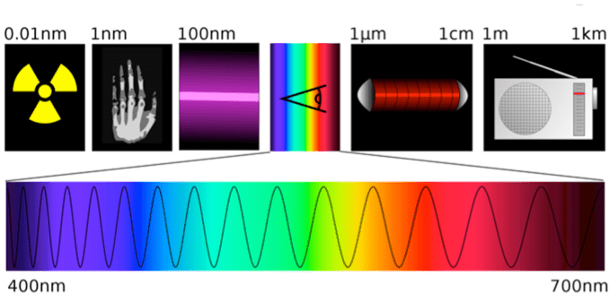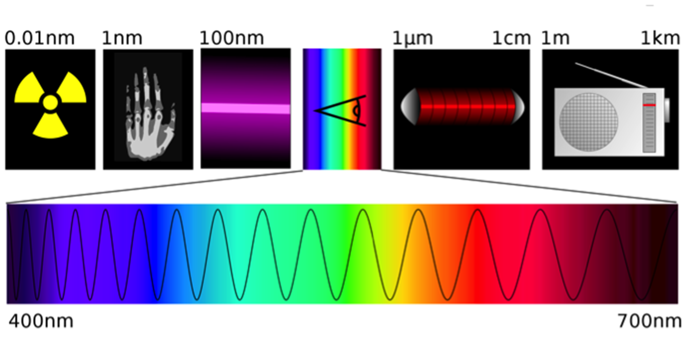Há diferentes formas de onda eletromagnética como os raios gama (presente em laboratórios de pesquisa), os raios X (utilizados em exames médicos), a radiação ultravioleta (do bronzeamento artificial), a luz visível, a radiação infravermelha (do controle remoto) e as ondas de rádio, formando o espectro eletromagnético. Na figura 1 a seguir, o comprimento de onda (uma característica da onda) é indicado para algumas formas de radiação.