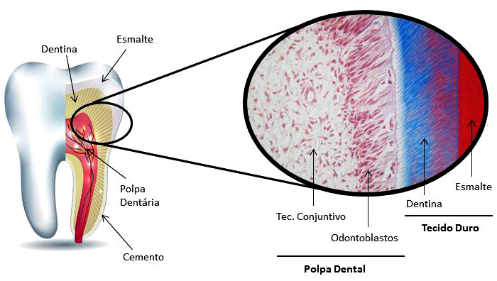 O dente é conhecido por ser um órgão formado por tecidos duros, sendo eles o esmalte, a dentina e o cemento (veja na Figura 1). Porém, em seu interior, protegido por esses tecidos duros, encontra-se um tecido mole, a polpa dentária. A polpa dentária é um tecido conjuntivo propriamente dito, como o que encontramos abaixo da nossa pele, sendo responsável pela nutrição celular, defesa e reparação, bem como a sensibilidade local. Sendo assim, a polpa dentária é onde encontramos a vitalidade de um dente. Um dente vital possui polpa dentária; um dente que não tem polpa (como os dentes que já tiveram tratamento de canal executado) são dentes desvitalizados. Dessa forma, a polpa dentária é o tecido responsável por toda a fisiologia do dente respondendo aos estímulos de dor, desencadeando a resposta inflamatória bem como a resposta de regeneração e reparação. Sem a polpa dentária, não temos mais esses estímulos.