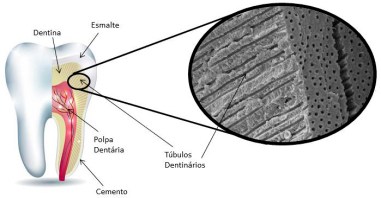 A dentina é um tecido duro (70% mineralizado) formado por cristais de hidroxiapatita em um arranjo tubular, ou seja, no sentido esmalte dentina, ela é transpassada por zilhões de minúsculos túneis, chamados de túbulos dentinários (ver Figura 2.