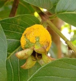 9- Austropuccinia psidii: esse fungo pertence ao grupo das ferrugens, que são patógenos de plantas. De modo geral, as ferrugens são específicas, mas essa espécie é generalista. Pode atacar centenas de espécies vegetais, principalmente do grupo das Myrtaceae, família do eucalipto e de várias frutíferas como goiaba, pitanga e jabuticaba (Fig. 4). Ou seja, além de ser um problema econômico atacando espécies cultiváveis, pode se espalhar por ambientes naturais e ser responsável por perda de diversidade de plantas nativas.