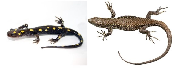 Legenda para figura: a esquerda uma salamandra (um anfíbio) e a direita um lagarto (um réptil). Fonte Thinglink