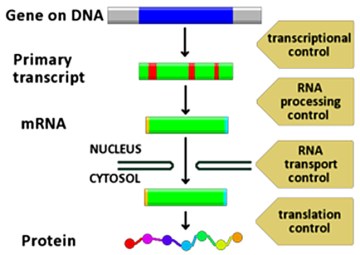 Figura 1. Esquema das principais etapas da expressão génica e respectivos pontos de controlo. Fonte: Wikipedia