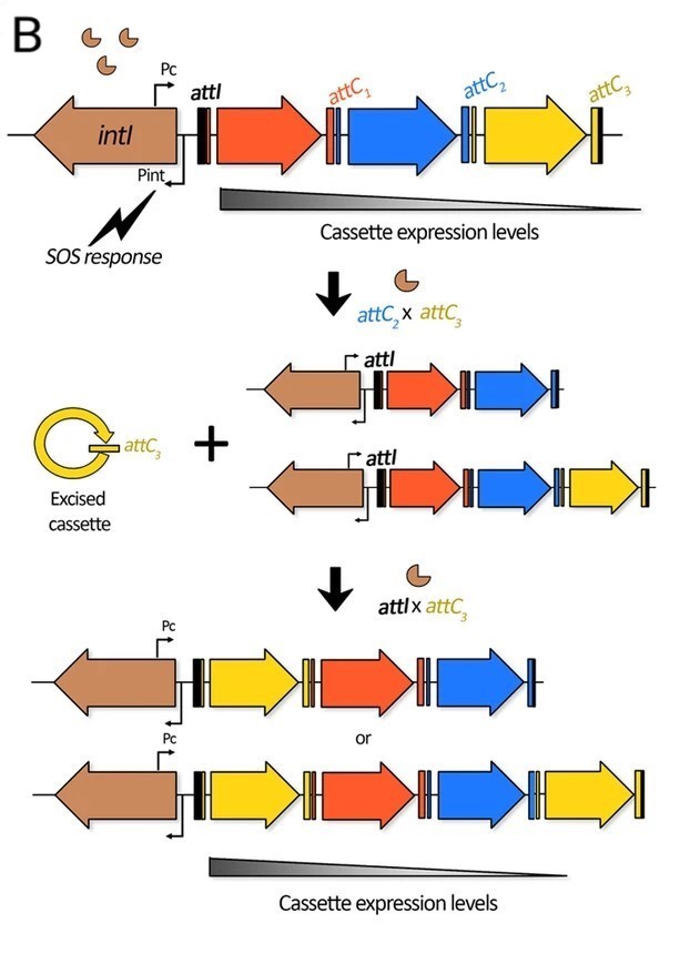 Ao examinar a sequência genética das estirpes que evoluíram das primeiras, “Os cientistas descobriram” uma gama de combinações relativamente à posição das três cassetes (Figura 2). Concretamente, nas maiores concentrações de antibióticos, a maioria das populações continha a mesma sequência de cassetes; as populações de controle, que não foram expostas a antibióticos ou apenas sujeitas a baixas concentrações, não mostraram qualquer variação estrutural na sequência de cassetes. Fundamentalmente, a presença da gentamicina, ao induzir a expressão da atividade da integrase, acelerou a evolução das estirpes gerando rapidamente diferentes combinações na composição de cassetes do integron, tendo sido selecionada em concentrações elevadas de gentamicina, a população em que a expressão da cassete de resistência à gentamicina era superior. Embora se possa gracejar que as bactérias evoluem “à la carte” (a pedido) quando expostas ao tratamento com antibióticos, este mecanismo explica como, sem qualquer “intencionalidade” da bactéria, é a atividade de integração que, ao gerar diversidade genética ao acaso, permite à seleção natural agir de encontro à sobrevivência da bactéria.
