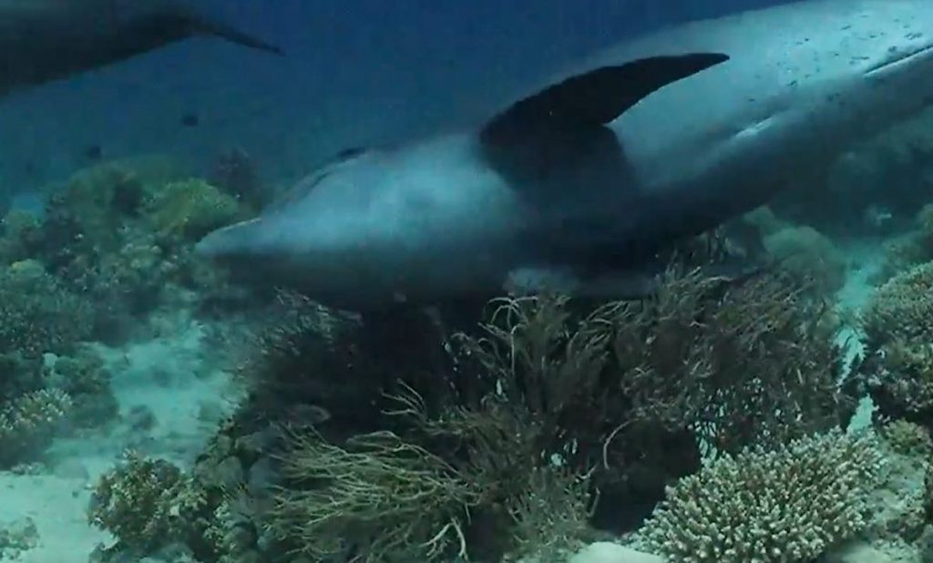 O golfinho esfregava as costas, o ventre e a cabeça contra alguns invertebrados marinhos disponíveis no sistema coralino. Isto ocorria seletiva e preferencialmente sobre a gorgônia5 Rumphella aggregata, o coral de couro Sarcophyton sp., e as esponjas Ircinia sp. (algumas dessas cenas aparecem no filme Blue Planet II Episodio 1 da BBC, Natural History Unit).