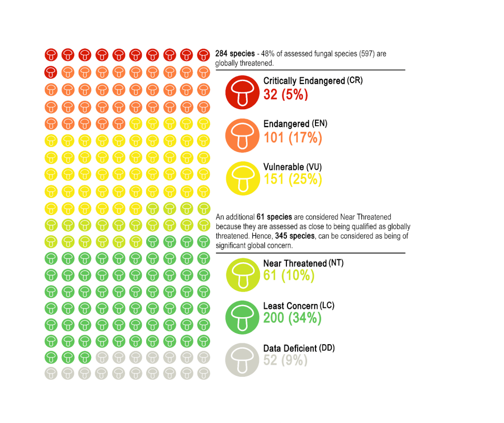 Das 597 espécies avaliadas até então, quase 50% estão enquadradas em uma das três categorias de ameaça, com 32 espécies Criticamente em Perigo, 101 Em Perigo e 151 na categoria Vulnerável. Se considerarmos a categoria Quase Ameaçada, que conta com 61 espécies, o número de espécies com algum grau de ameaça de extinção sobe para 57%. O restante das espécies foi enquadrado em Pouco Preocupante, ou seja, não corre ameaça de extinção, ou em Dados Deficientes, onde não há a possibilidade de avaliar o grau de ameaça da espécie por conta da falta de dados. A maioria das espécies avaliadas forma cogumelos, o que reflete o fato de que 46% das espécies avaliadas são ectomicorrízicas (fungos que beneficiam as plantas através de relações com as raízes). As florestas são o habitat para a esmagadora maioria de espécies, contando com uma proporção de 72,9% das espécies avaliadas, seguidas dos campos, com 8,2%. Em termos de regiões com maior número de espécies avaliadas, o Neártico (que inclui países como os Estados Unidos e Canadá) conta com 273 espécies, seguido do Paleártico (Europa e parte da Ásia) com 184 espécies e a região Neotropical (América do Sul e Central), com 170 espécies.