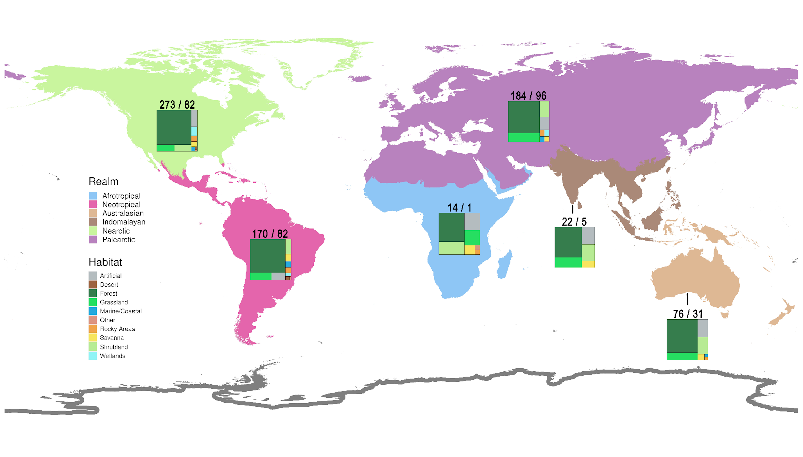 - Quais habitats e países estão mais bem representados nas avaliações?