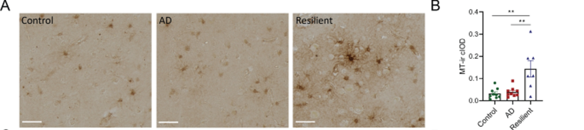 Investigaram mudanças globais na expressão gênica no giro frontal (importante para funções executivas, como a memória e a flexibilidade cognitiva, ambas prejudicadas na AD) e verificaram que 897 genes foram significativamente alterados entre AD e controle, 1121 entre resilientes e o controle, e 6 entre resilientes e AD.