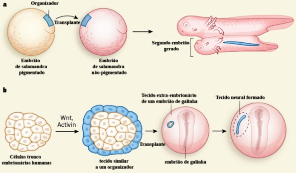 Cientistas descobriram que em humanos ocorre a presença de uma estrutura que havia sido identificada inicialmente em embriões de sapos, há quase 100 anos atrás. Essa estrutura chama-se Organizador (tradução literal de “Organizer”). A história da descoberta do Organizador em sapos é por si só fascinante. Em 1924, Hans Spemann e sua aluna de doutorado Hilde Mangold fizeram o transplante de uma pequena região contendo um grupo de células de um embrião de uma espécie de salamandra (pigmentada) para uma outra espécie (não pigmentada) (Figura. 1a). O resultado foi absolutamente extraordinário: o grupo de células que foi transplantado foi capaz de induzir a formação de um segundo embrião parcial no tecido hospedeiro. Dessa forma, esse grupo de células transplantado tinha o poder de induzir os tecidos do hospedeiro a mudar seus “destinos” e formarem outras estruturas, originando um ser vivo novo e completo. Na verdade, esse segundo embrião formado, apenas um pouco menor, parecia um gêmeo siamês e era constituído pelo tecido transplantado, mas majoritariamente pelo tecido do hospedeiro. Continuar lendo