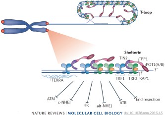 As nossas células têm 23 pares de cromossomas e durante a divisão celular o DNA cromossómico terá que replicar de forma que uma cópia de cada cromossoma seja transmitida a cada uma das duas novas células-filhas que se formam. Acontece que, nos organismos eucariotas*, devido a particularidades do processo de replicação, as enzimas responsáveis por esse processo não conseguem duplicar a sequência de DNA até às extremidades dos cromossomas. Quais seriam as consequências disto? De cada vez que uma célula/DNA replicasse as extremidades dos cromossomas corriam o risco de ficarem encurtadas e, consequentemente, perder-se a informação genética aí contida.